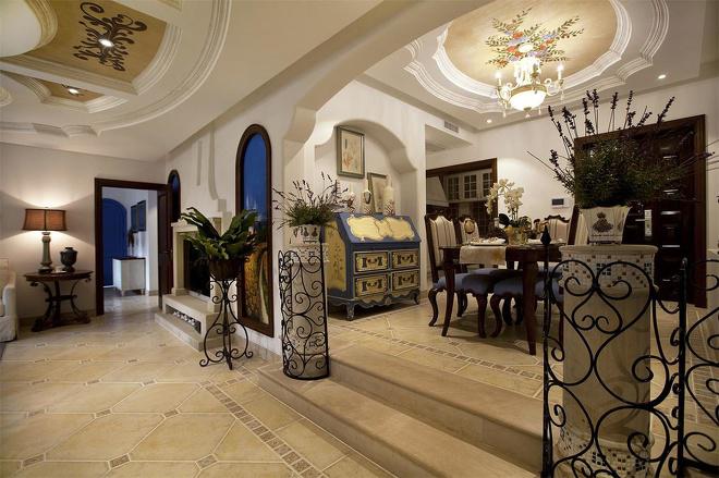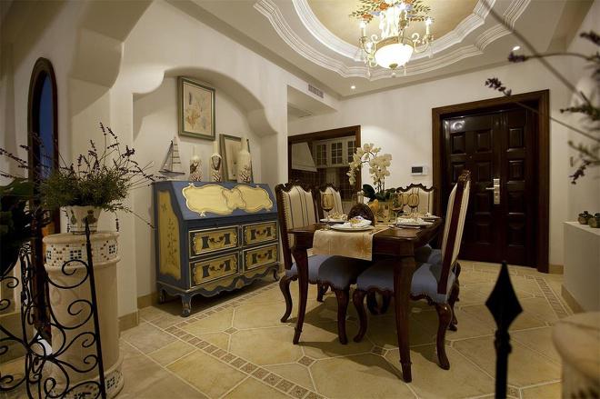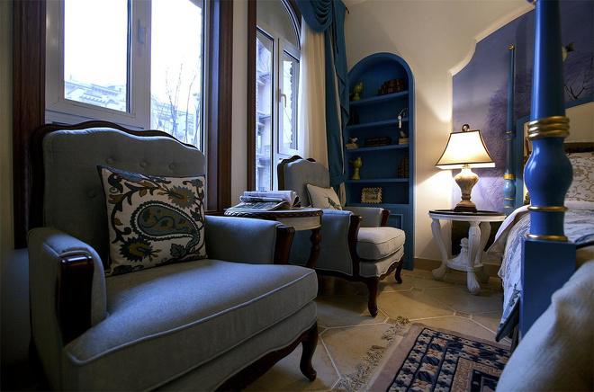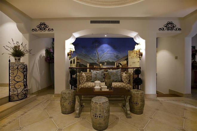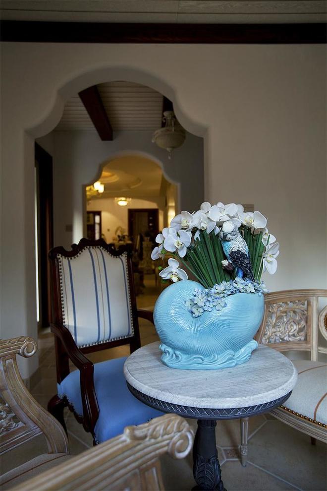 推門而入,普利亞南部薰衣草飄來的藍紫色香氣芬芳馥郁。海與天明亮的色彩干凈清爽,自然清新的玄關,色彩淺淡的地板和淡色的墻壁相呼應??蛷d中充斥著拱門和馬蹄狀的造型,家具也以藍色以及木色為主色調,且多是線條簡單修邊渾圓的木質家具。部分家具特意擦淡做舊,表現出自然清新的感覺。