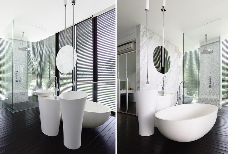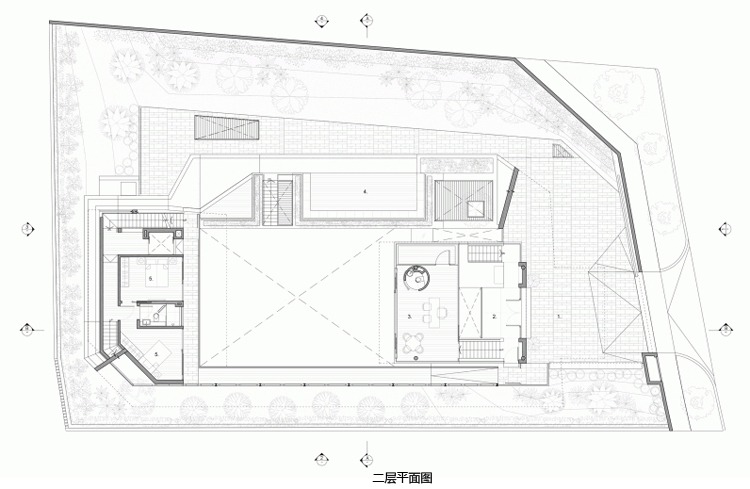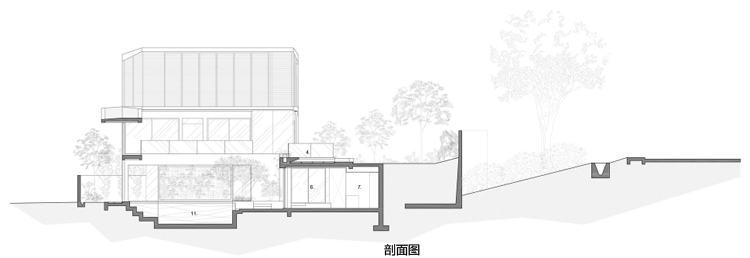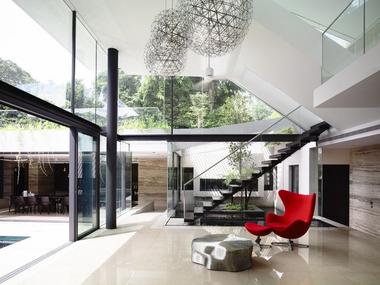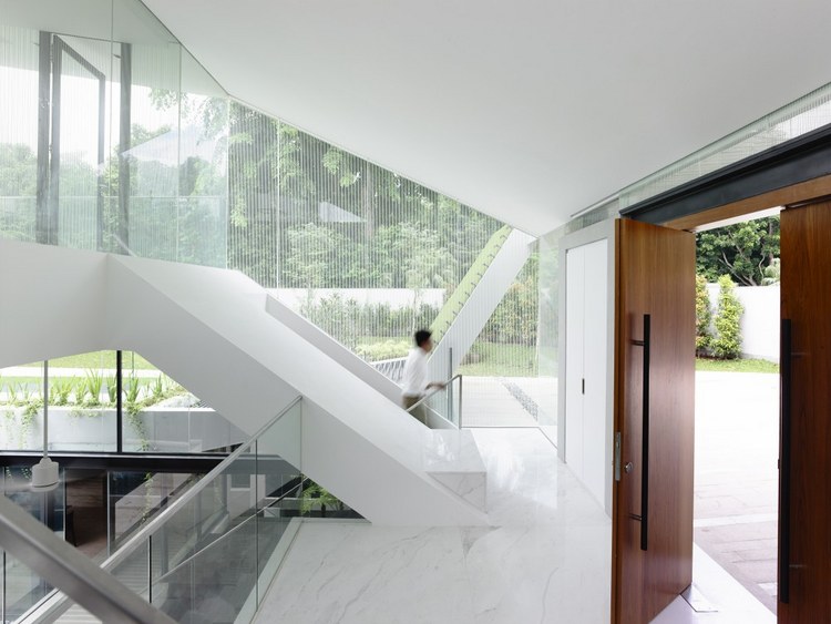 別墅設計安德魯路私人別墅(Andrew Road)設計師將與街面水平的這一層打造為封閉式的樣式,從入口處可以看到中央院落巨大的游泳池,四面各功能房采用了透明玻璃設計,高于街面水平層的二三層樓的屋頂略大于房屋,如鍋蓋一樣將房屋罩在下面。長條式的格柵落地玻璃窗設計與其他部分的設計相呼應,體現了整個別墅簡明的風格樣式。D字型的內部空間設計將房間主要設置在半弧形的位置,過道和樓梯則位于D字形垂直的豎向位置,起到了隔離噪音等作用。